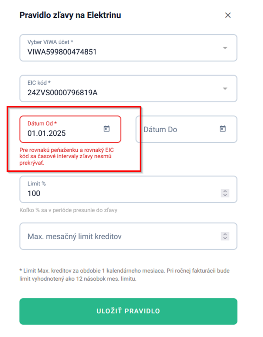 Pozor, nie je možné nastaviť viac zliav z toho istého účtu ViWA pre rovnaký EIC kód v rovnakom termíne. Systém vám vyhodí chybu: