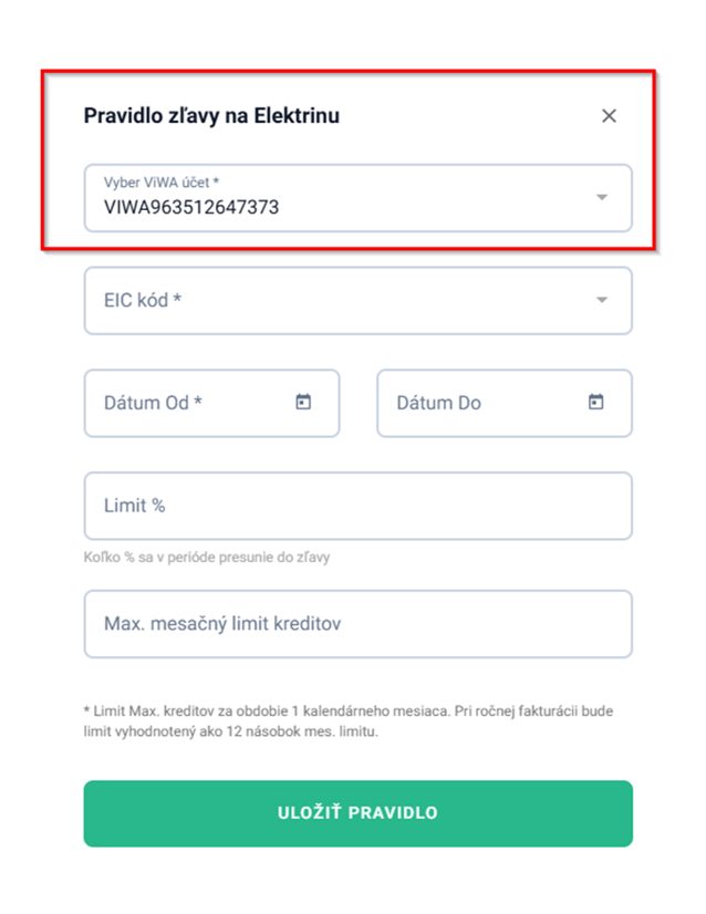 5. Nastavte limit v %. Koľko % z vašich dostupných kreditov sa presunie do zľavy z faktúry. Ak zvolíte 100%, celý objem kreditu sa presunie do zľavy z dodávky na danom odbernom mieste.