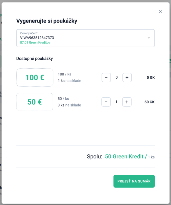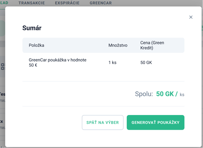 3. Nasleduje sumarizačné okno, kde vidíte koľko poukážok a v akej hodnote si idete premeniť a koľko jednotiek Green Kredit Vám bude stiahnutých z účtu. Ak súhlasíte, kliknite na „Generovať poukážky“. Ak nie, jednoducho sa vrátite späť cez „Späť na výber."