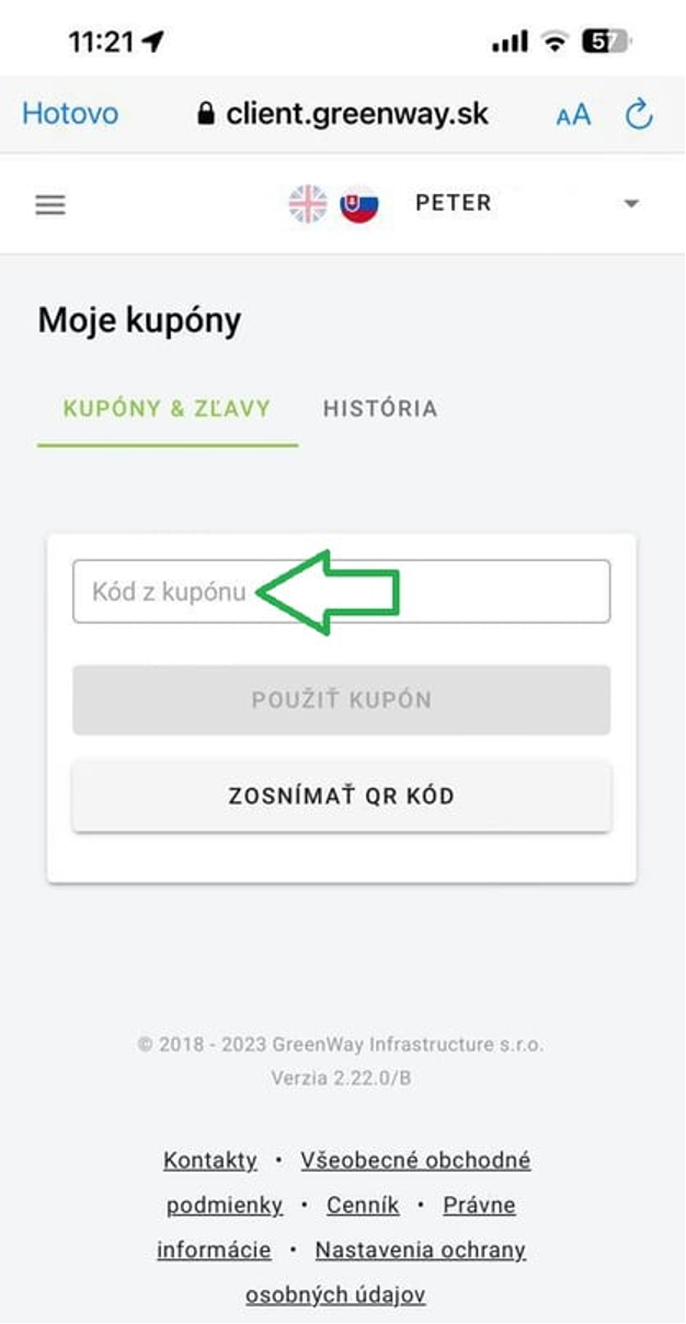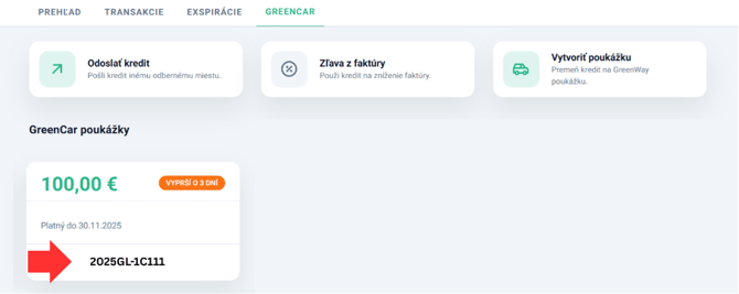 4. Vygenerované poukážky uvidíte v záložke GreenCar. Daný kód vložíte do vášho Zákazníckeho konta v GreenWay.
