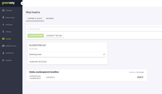 7. Po zadaní kupónu, v klientskej zóne GreenWay, v časti "Kupóny" je vidieť aktuálnu výšku kreditu: