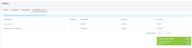 8. Výšku dobitého kreditu je možné sledovať v ľavom menu „Faktúry“, v časti „Priebežné náklady“. Tu sa zobrazuje aktuálna výška budúcej faktúry + výška zľavy (tá je uvedená v záporných číslach, nakoľko bude z faktúry odpočítaná):