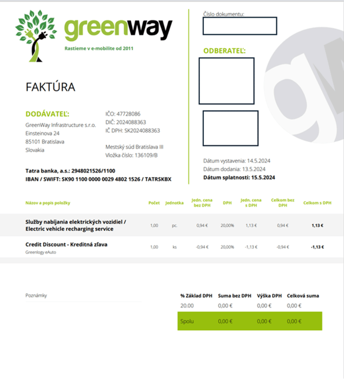 9. V rámci mesačného zúčtovania Vaša faktúra bude vyzerať takto (položka Greenlogy eAuto):